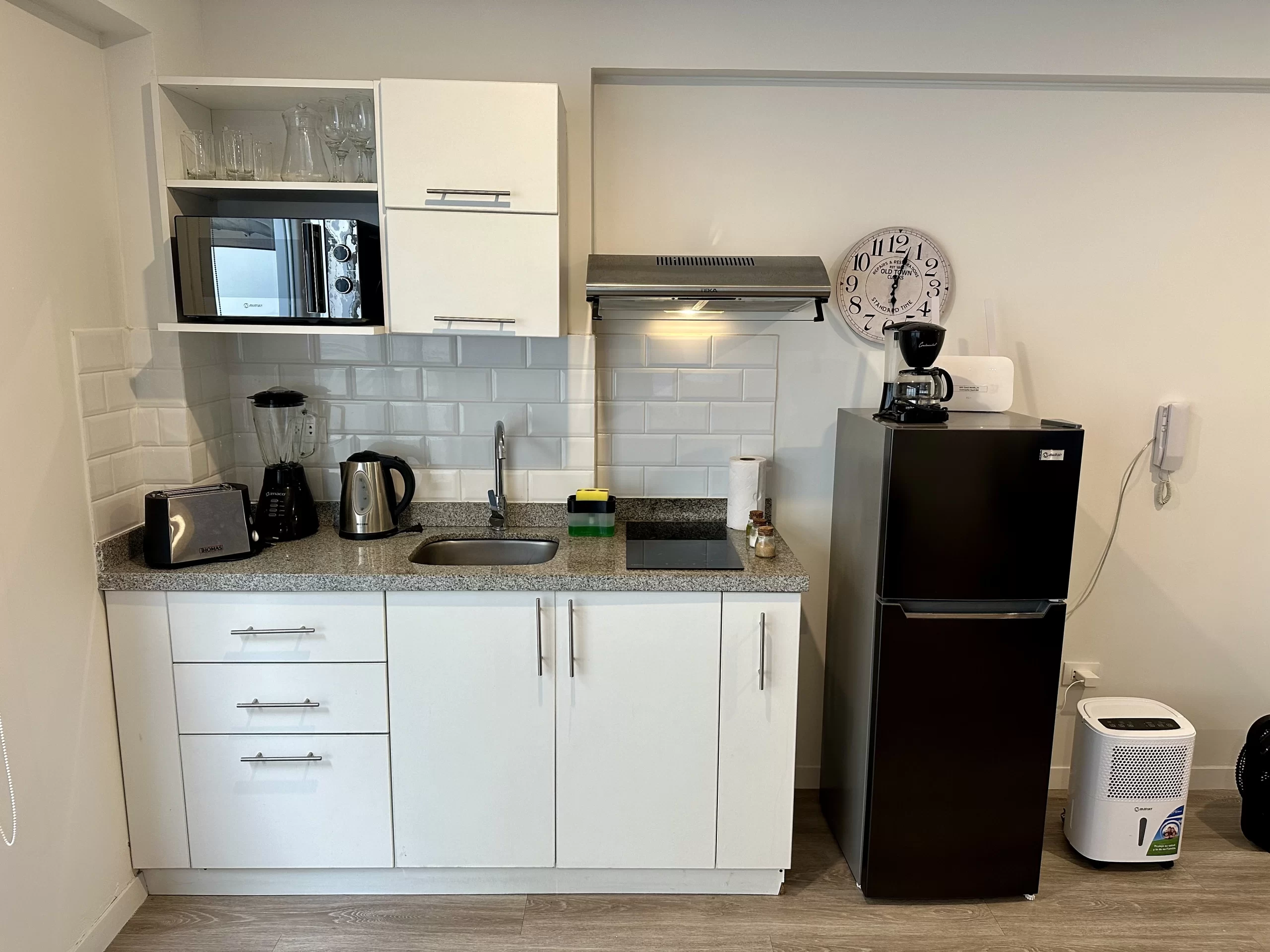 Estudio con cama queen y amplia terraza. El edificio dispone de zona de coworking y lavandería común